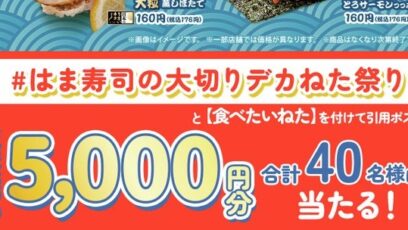 SNS応募の懸賞【X懸賞】はま寿司で使えるお食事優待券5,000円分を40名様にプレゼント
