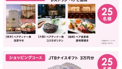 ネット応募の懸賞選べる体験カタログギフト レストラン ペアご招待、JTBナイスギフト3万円分を合計50名様にプレゼント