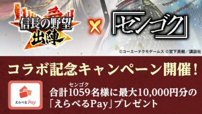 戦国ウォークゲーム『信長の野望 出陣』‐えらべるPay10,000円分抽選キャンペーン 賞品:最大10,000円分のえらべるPay(合計1059名様) 締切:2026年2月...