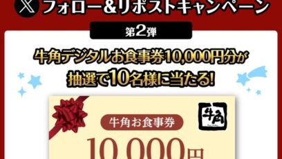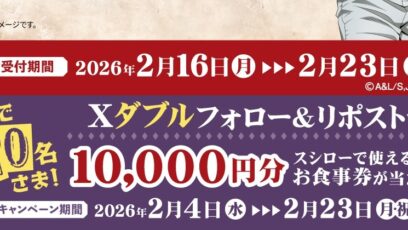 スシロー‐プレゼントキャンペーン 賞品:スシローで使えるお食事券10,000円分(20名様) 締切:2026年2月23日(月) 応募方法: 対象Xアカウントをダブル...