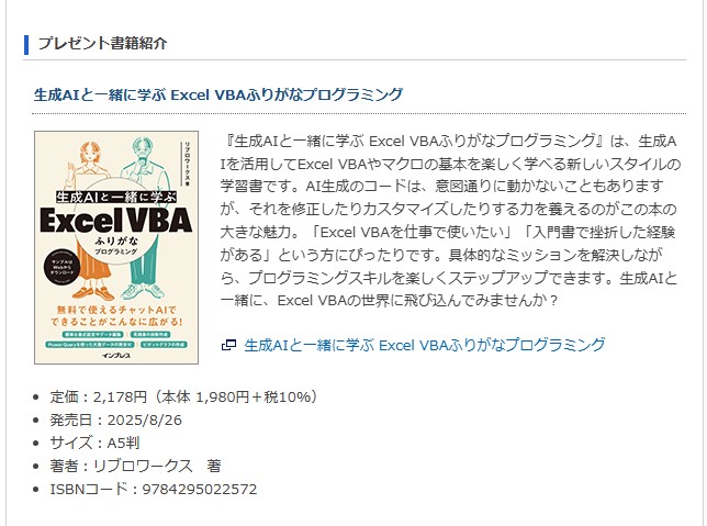 『生成AIと一緒に学ぶ Excel VBAふりがなプログラミング』を3名様にプレゼント 2025.10.03 2025.10.02モーグ‐書籍プレゼントキャンペーン 賞品:生成AIと一緒に学ぶ Excel VBAふりがなプログラミング(3名様) 締切:2025年11月4日 9:59応募フォームよりアンケートに答えてご応募ください。※詳細はキャンペーンページにてご確認ください。応募はこちらから