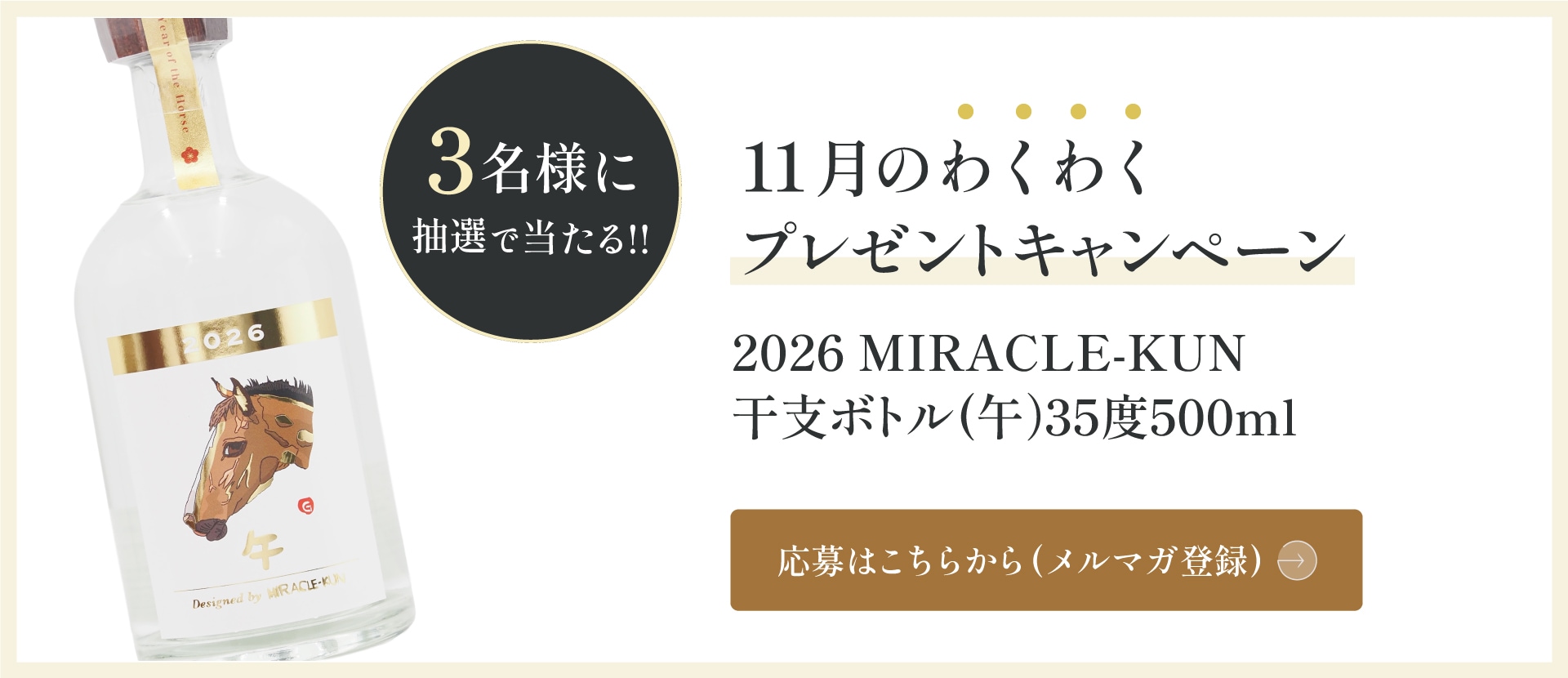 賞品:2025 MIRACLE-KUN干支ボトル 35度 500ml(3名様)