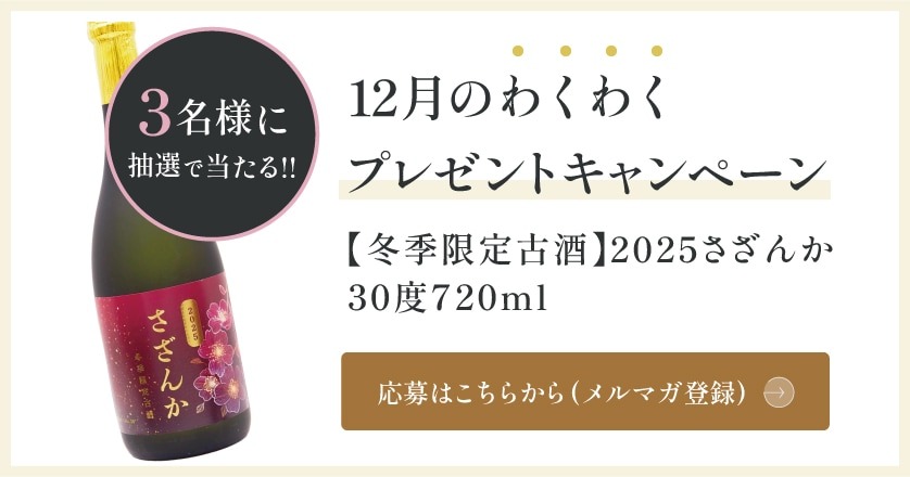 冬季限定古酒 2025さざんか30度720mlを3名様にプレゼント 2025.12.03 2025.12.02忠孝酒造 わくわくプレゼントキャンペーン 賞品:冬季限定古酒 2025さざんか30度720ml(3名様) 締切:2025年12月31日(水)メルマガ購読期間中はずっとプレゼントが当たるチャンスがあります。※詳細はキャンペーンページにてご確認ください。応募はこちらから