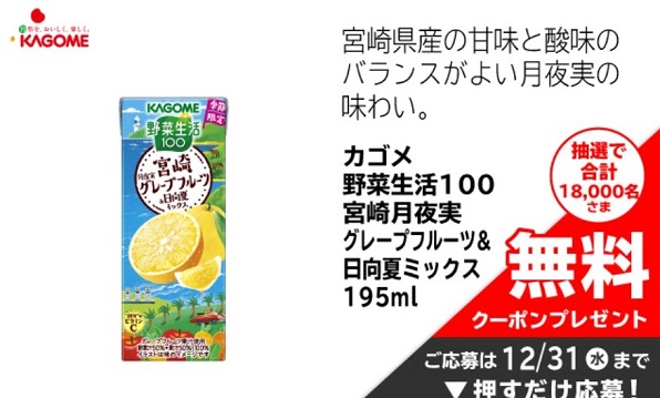 【アプリ】野菜生活100宮崎月夜実グレープフルーツ&日向夏ミックス 195ml 無料クーポンを18,000名様にプレゼント 2025.12.28イオンお買物アプリ‐プレゼントキャンペーン 賞品:野菜生活100宮崎月夜実グレープフルーツ&日向夏ミックス 195ml 無料クーポン 18000名さま 締切:2025年12月31日(水)アプリ内からご応募ください。※詳細はキャンペーンページにてご確認ください。応募はこちらから