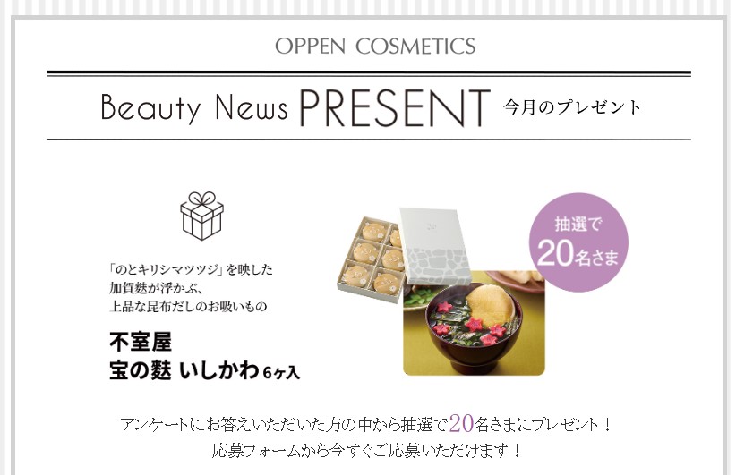 不室屋 宝の麩 いしかわ6ヶ入を20名様にプレゼント 2025.09.21オッペン化粧品 Beauty News 今月のプレゼント 賞品:不室屋 宝の麩 いしかわ6ヶ入(20名様) 締切:2025年11月20日(木)アンケートにお答えいただいた方の中から抽選で20名さまにプレゼント!※詳細はキャンペーンページにてご確認ください。応募はこちらから