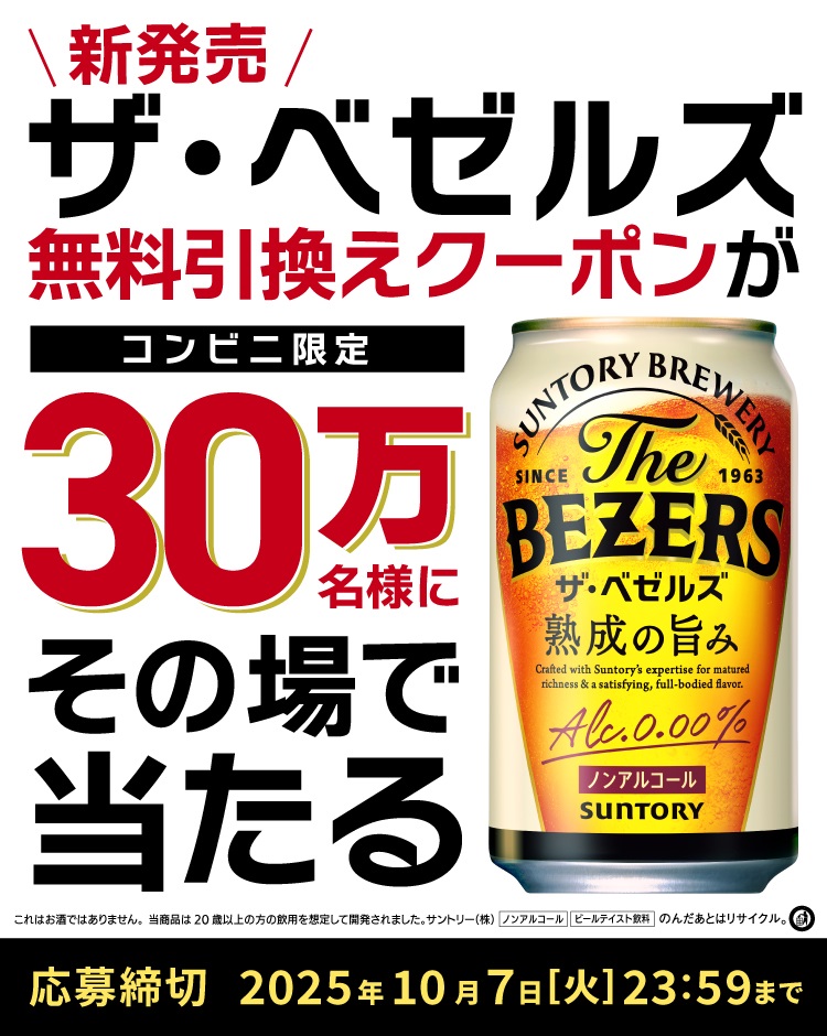 賞品:ノンアルコールビール「ザ・ベゼルズ 350ml缶」1本コンビニ無料引き換えクーポン(30万名様)