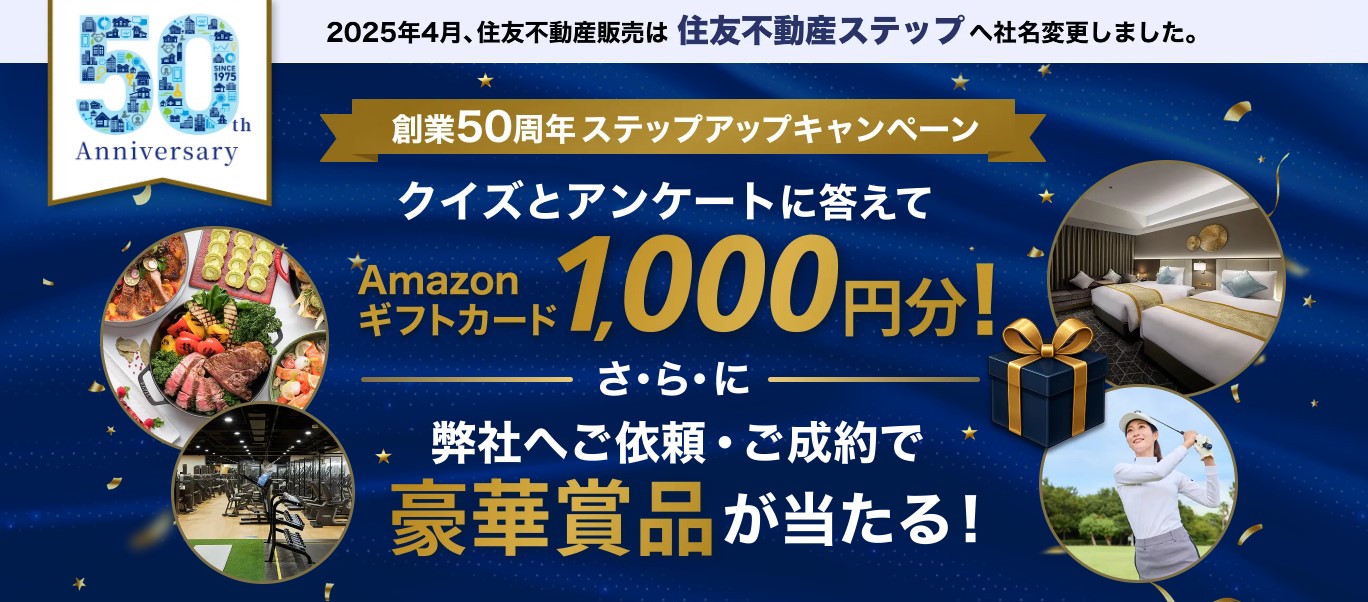 Amazonギフト券1,000円分を毎月500名様にプレゼント 2025.09.28住友不動産ステップ創業50周年ステップアップキャンペーン 賞品:Amazonギフト券1,000円分(毎月500名様) 締切:2025年10月31日(金)クイズとアンケートに答えてAmazonギフトカードが当たる!※詳細はキャンペーンページにてご確認ください。応募はこちらから