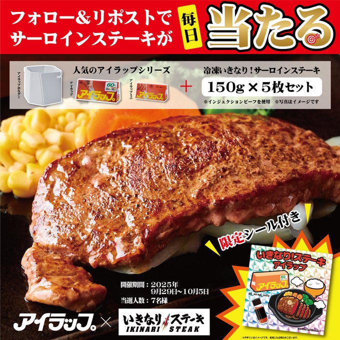 賞品:冷凍いきなりサーロイン&アイラップセット・コラボ限定シール付き(7名様)