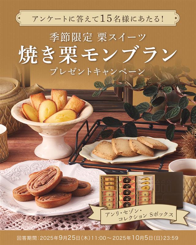 アンケートにお答えいただいた方の中から抽選で15名様に、”焼き“が決め手の秋のフィナンシェ「焼き栗モンブラン」と定番のフィナンシェ・マドレーヌを詰め合わせた「アンリ・セゾン・コレクション Sボックス」をプレゼント