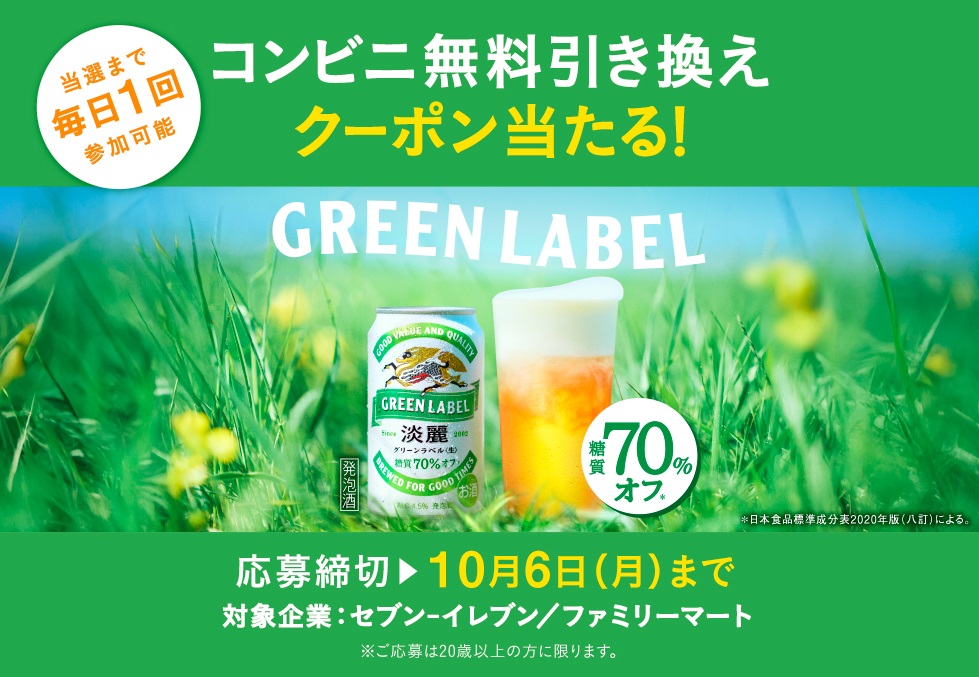 淡麗グリーンラベル コンビニ無料引き換えクーポンが当たる!