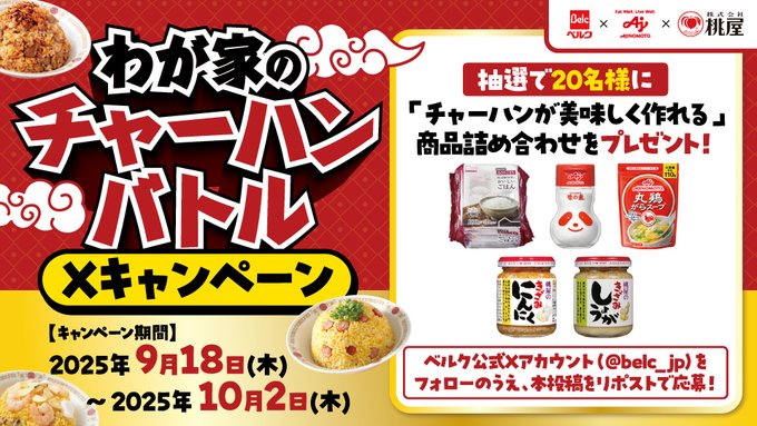 賞品:チャーハンを美味しく作れるベルク・味の素・桃屋商品詰め合わせ(20名様)