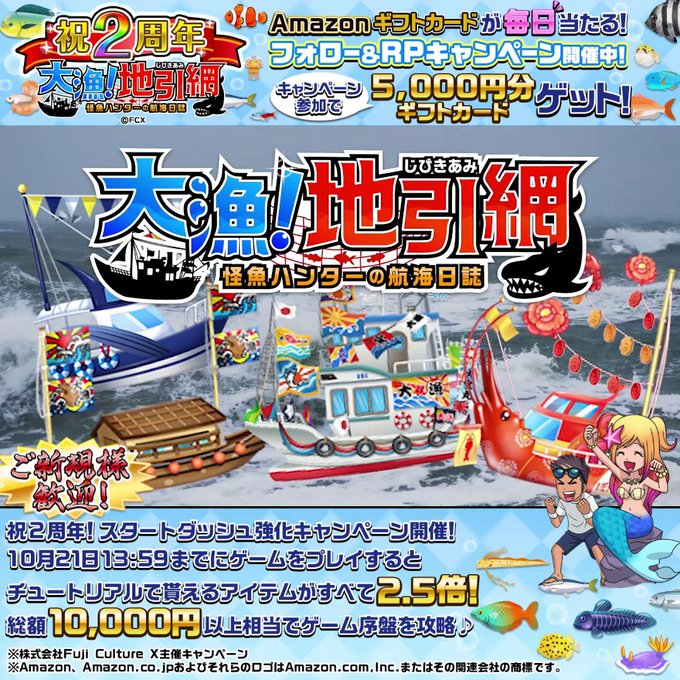 【毎日・X懸賞】Amazonギフト券5,000円分を7名様にプレゼント 2025.09.30大漁!地引き網 祝2周年記念キャンペーン 賞品:Amazonギフト券5,000円分(7名様)大漁!地引き網公式X(Twitter)アカウントをフォロー&キャンペーン対象ポストをリポストしてご応募ください。※詳細はキャンペーンページにてご確認ください。応募はこちらから