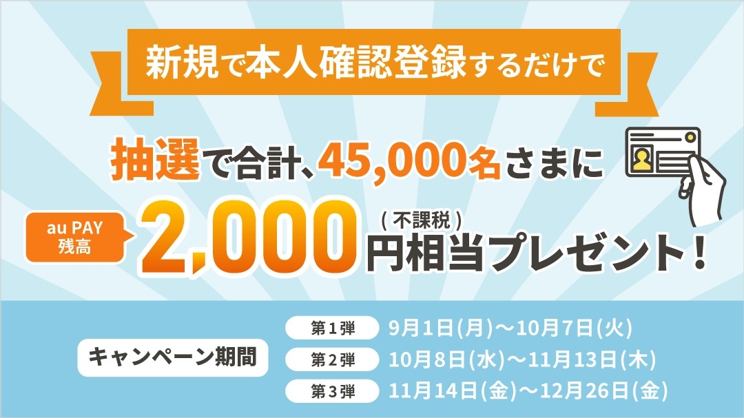 au PAYで本人確認登録を行うお客さまを対象に、抽選で合計45,000名に2,000円相当のau PAY 残高が当たる!