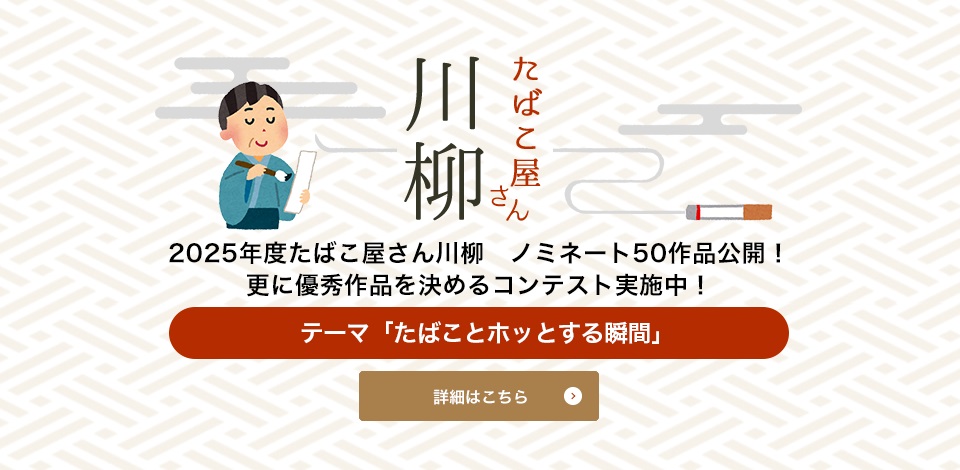 JCBギフトカード1,000円分を15名様にプレゼント 2025.09.30あなたが選ぶ「たばこ屋さん川柳」2025 賞品:JCBギフトカード1,000円(15名様) 締切:2025年11月13日(木)ノミネート作品からそれぞれお好きな川柳を1首選び、応募フォームからお送りください。※詳細はキャンペーンページにてご確認ください。応募はこちらから