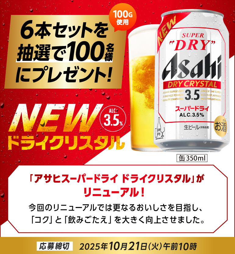 賞品:アサヒスーパードライ ドライクリスタル 缶350ml×6本(100名様)