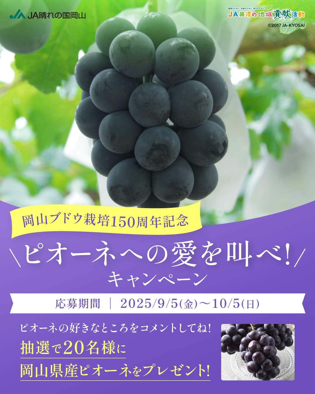 【Instagram懸賞】旬の岡山県産ピオーネを20名様にプレゼント 2025.10.01JA晴れの国岡山‐ピオーネへの愛を叫べ !キャンペーン 賞品:旬の岡山県産ピオーネ(20名様) 締切:2025年10月5日(日)応募方法: 投稿に「ピオーネの好きなところ」をコメント※詳細はキャンペーンページにてご確認ください。応募はこちらから