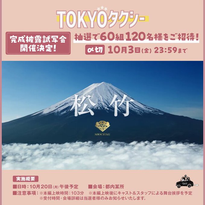 【X懸賞】映画『TOKYOタクシー』完成披露試写会ご招待を60組120名様にプレゼント 2025.10.01映画『TOKYOタクシー』‐プレゼントキャンペーン 賞品:映画『TOKYOタクシー』完成披露試写会 ご招待(60組120名様) 締切:2025年10月3日(金)フォロー&RP&フォーム記入で 60組120名様をご招待✨※詳細はキャンペーンページにてご確認ください。応募はこちらから