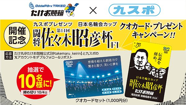 【X懸賞】大会特製クオカード&東スポクオカードを10名様にプレゼント 2025.10.01九スポ‐フォロー&リポストキャンペーン 賞品:大会特製クオカード&東スポクオカード(10名様) 締切:2025年10月4日(土)Wをフォロー&キャンペーン対象ポストをリポストしてご応募ください。※詳細はキャンペーンページにてご確認ください。応募はこちらから