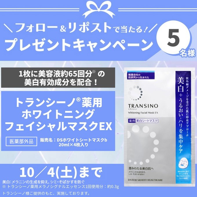 賞品:トランシーノ薬用 ホワイトニングフェイシャルマスクEX(5名様)