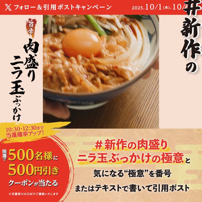 丸亀製麺‐#新作の肉盛りニラ玉ぶっかけの極意 フォロー&引用ポストキャンペーン