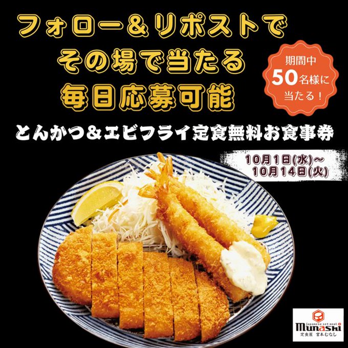 賞品:定食屋宮本むなしでご利用いただける「とんかつ&エビフライ定食」1人前のデジタルお食事券(50名様)