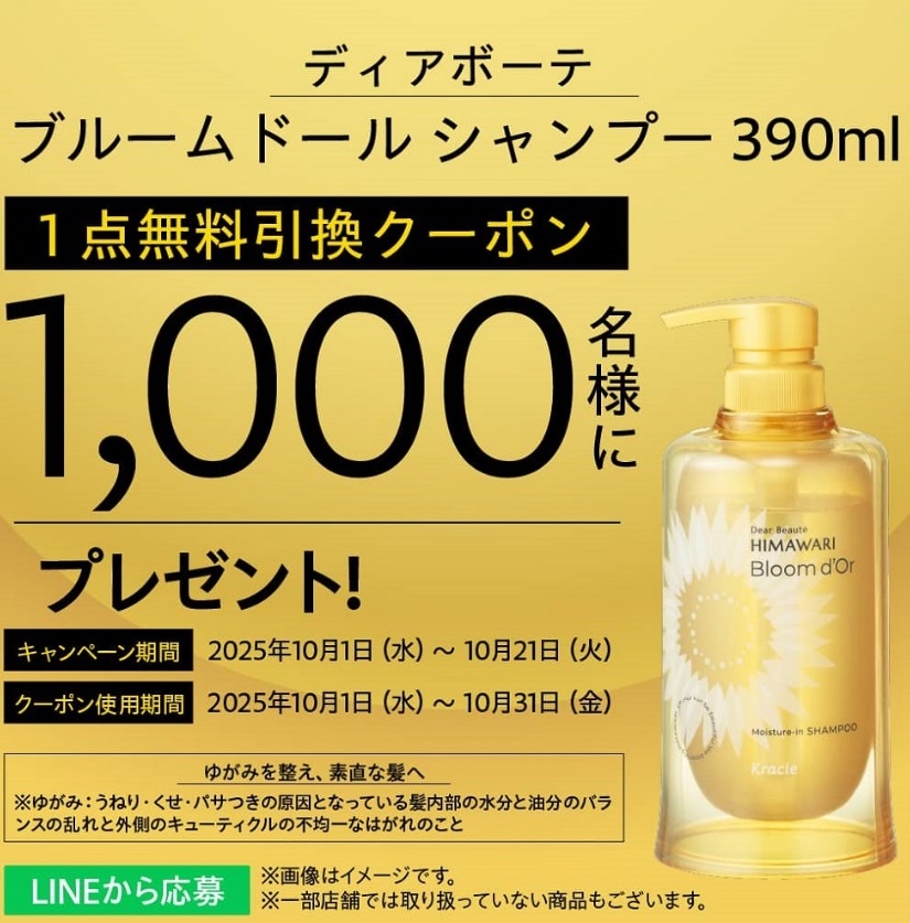 賞品:ディアボーテ ブルームドール シャンプー 390ml 1個無料引換クーポン(1,000名様)