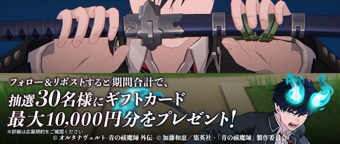 『オルタナヴェルト -青の祓魔師 外伝-』公式X(Twitter)アカウントをフォロー&キャンペーン対象ポストをリポストしてご応募ください。