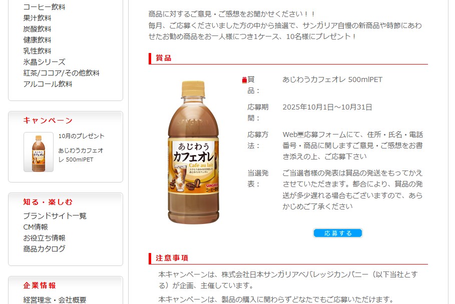 サンガリア自慢の新商品や時節にあわせたお勧め商品をお一人様につき1ケース、10名様にプレゼント!