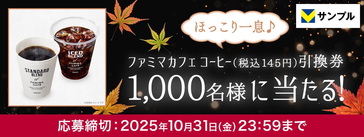 ファミマカフェのコーヒー無料引換券を1,000名様にプレゼント 2025.10.04Vサンプル‐ほっこり一息♪秋のファミマカフェのコーヒープレゼントキャンペーン 賞品:ファミマカフェのコーヒー引換券(1,000名様) 締切:2025年10月31日(金)ご応募には会員登録/ログインが必要です。※詳細はキャンペーンページにてご確認ください。応募はこちらから