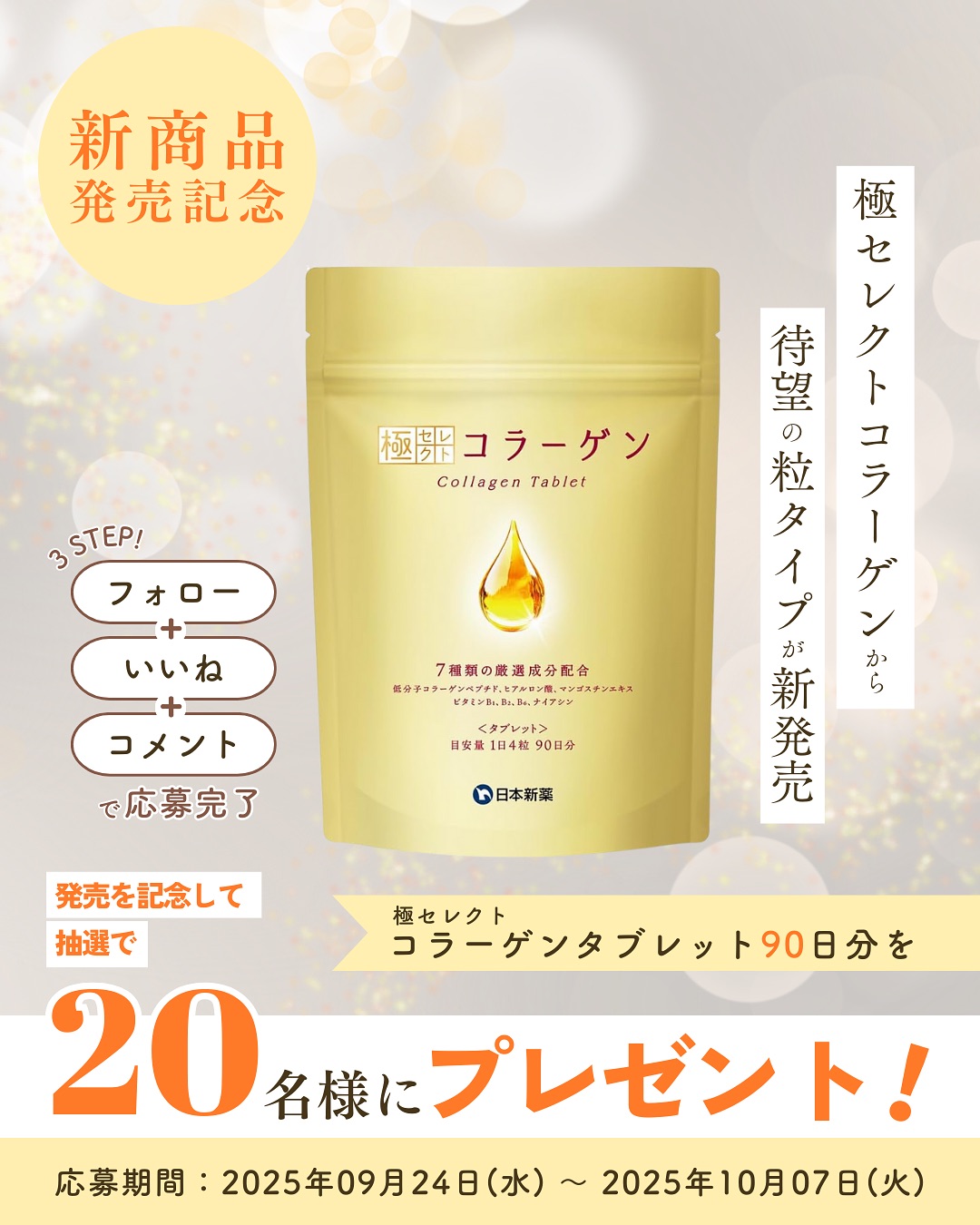 賞品:極セレクトコラーゲン タブレット90日分(20名様)