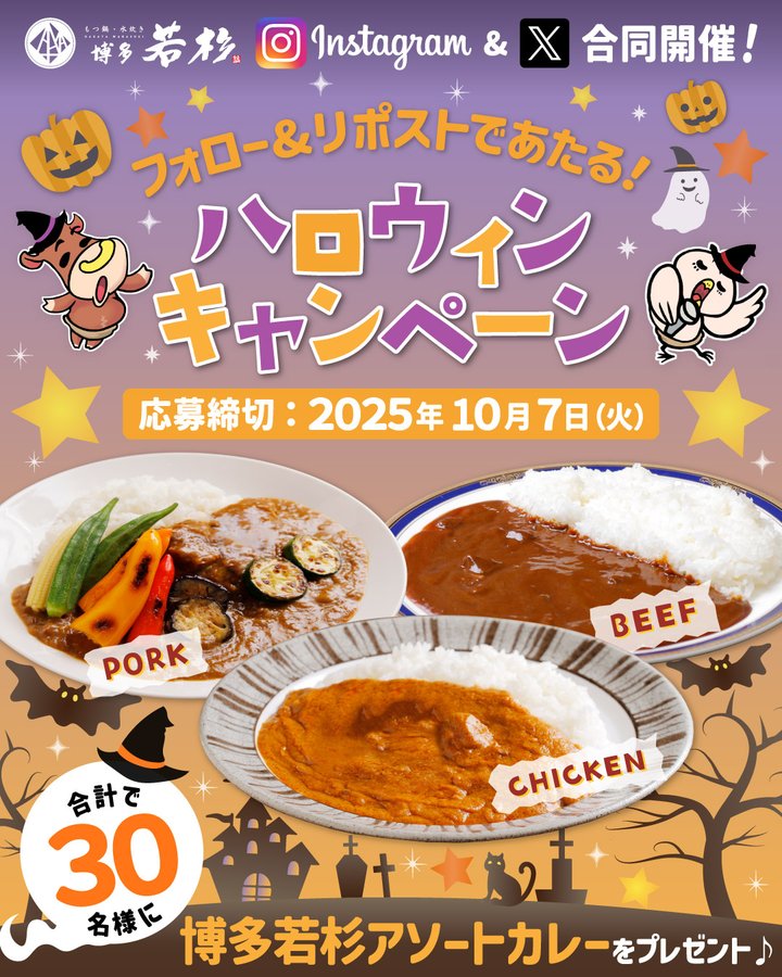 【X・Instagram懸賞】博多若杉アソートカレー3種お試しセットを30名様にプレゼント 2025.10.05もつ鍋・水炊き 博多若杉‐ハロウィンキャンペーン 賞品:博多若杉アソートカレー3種お試しセット(30名様) 締切:2025年10月7日(火)Instagram&Xで合計3⃣0⃣名様に 若杉カレーをプレゼント 🎁✨※詳細はキャンペーンページにてご確認ください。応募はこちらから