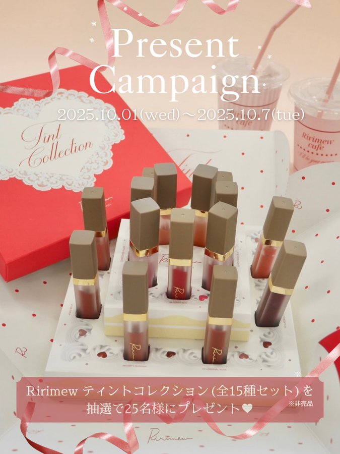 賞品:Ririmewのセンシュアルフィックスティント(全8種)+ミューテッドシアーティントが詰まったスペシャルボックス(25名様)