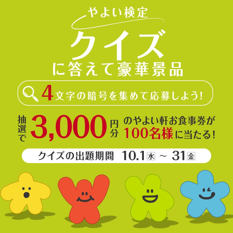 期間中公式アプリ内にある、やよい検定特設ページより、やよい軒に関する4つのクイズに答えて、暗号を集めてください。集めた暗号を専用の応募フォームに入力し、全て正解した方の中から抽選で100名様に、やよい軒で使える3,000円分のお食事券をプレゼント。