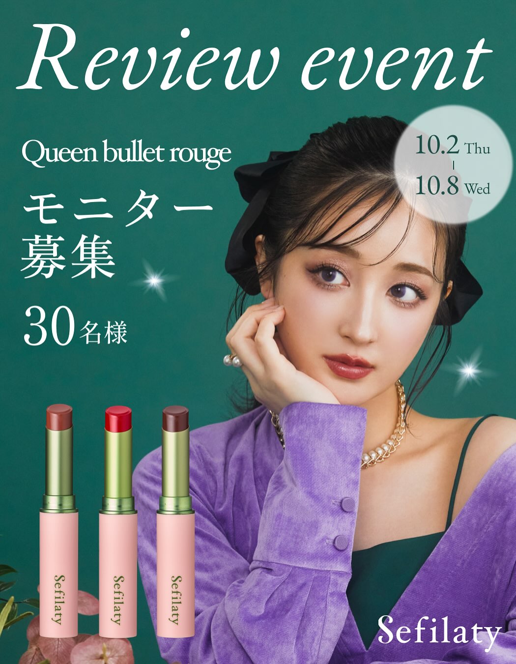 【Instagram懸賞】クイーンバレットルージュ 3色を30名様にプレゼント 2025.10.06Sefilaty‐モニターキャンペーン 賞品:クイーンバレットルージュ 3色(30名様) 締切:2025年10月8日(水)Sefilatyの商品を体験していただける方を大募集!※詳細はキャンペーンページにてご確認ください。応募はこちらから