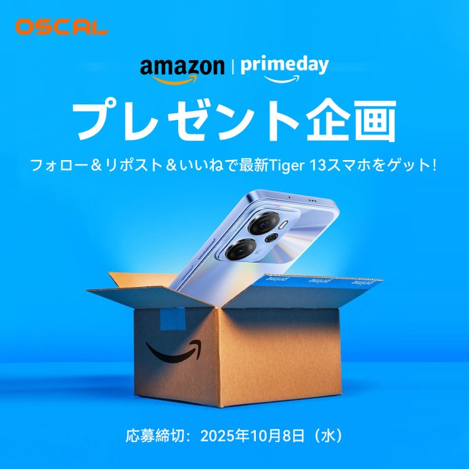 【X懸賞】OSCAL スマホ Tiger 13を1名様にプレゼント 2025.10.06OSCAL Japan‐Amazonプライムデー特別企画 賞品:OSCAL スマホ Tiger 13(1名様) 締切:2025年10月8日(水)応募方法 ① @OscalJapan をフォロー ② 投稿をRT&いいね※詳細はキャンペーンページにてご確認ください。応募はこちらから