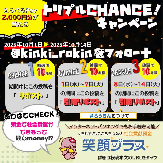 【X懸賞】えらべるPay2,000円分を10名様にプレゼント 2025.10.06近畿ろうきん‐プレゼントキャンペーン 賞品:えらべるPay2000円分(10名様) 締切:2025年10月8日(水)応募方法: アカウントをフォロー #ろうきん をつけて #引用リポスト※詳細はキャンペーンページにてご確認ください。応募はこちらから