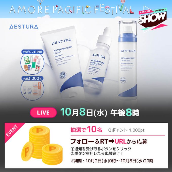 【X懸賞】Qポイント1,000ptを10名様にプレゼント 2025.10.06Qoo10‐プレゼントキャンペーン 賞品:Qポイント1,000pt(10名様) 締切:2025年10月8日(水)20:00【応募方法】 ①アカウントをフォロー & 投稿をRT ②URLよりライブ通知を受け取る※詳細はキャンペーンページにてご確認ください。応募はこちらから