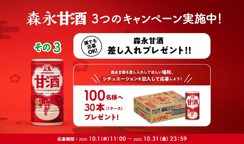 賞品:森永甘酒30本(1ケース)を差し入れ(100名様)
