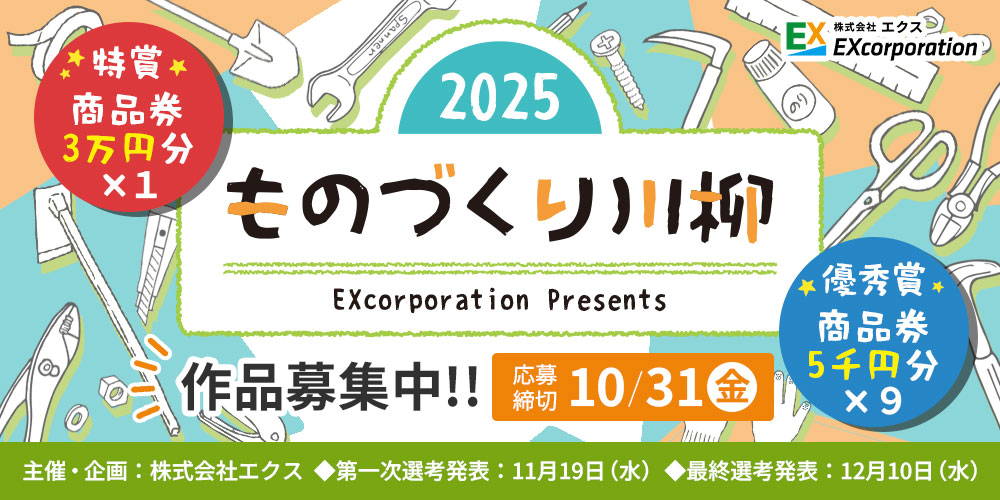 【川柳】商品券最大30,000円分を合計10名様にプレゼント 2025.10.07 2025.10.06株式会社エクス‐ものづくり川柳 賞品: 特賞 3万円の商品券(1作品) 優秀賞 5千円の商品券(9作品) 締切:2025年10月31日(金)『ものづくり川柳』作品募集中。※詳細はキャンペーンページにてご確認ください。応募はこちらから