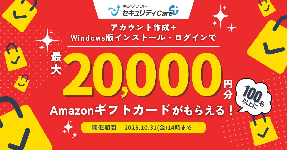 キングソフトセキュリティCare+のWindows版のインストール・ログインと新規アカウントを作成頂いた方の中から、抽選で105名様に最大2万円分のAmazonギフトカードがあたる!