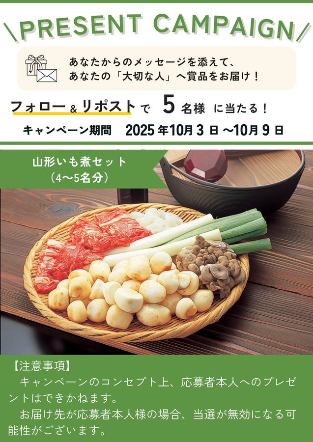 賞品:あなたの「大切な人」へ”山形いも煮セット(4~5名分)”(5名様)