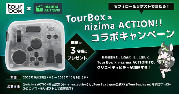 @nizima_actionと@TourBoxJapanをフォロー&キャンペーン対象ポストをリポストしてご応募ください。
