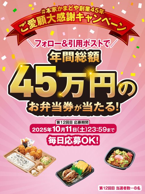 ② #本家かまどや創業45年 をつけて【10月新商品の中から食べたいお弁当】と一緒に投稿を引用ポスト