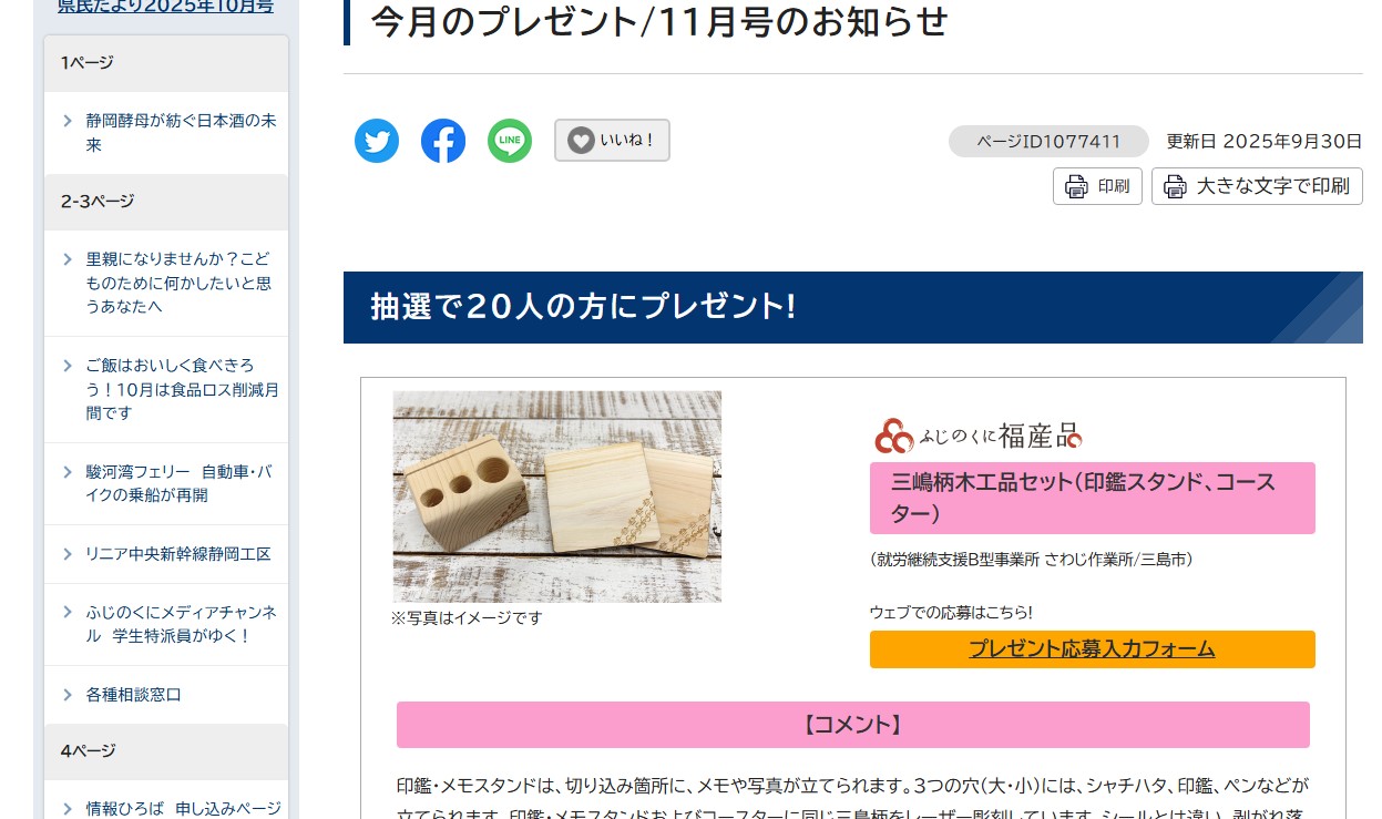 三嶋柄木工品セット(印鑑スタンド、コースター)を20名様にプレゼント 2025.10.08静岡県‐県民だより 今月のプレゼント 賞品:三嶋柄木工品セット(印鑑スタンド、コースター)(20名様) 締切:2025年10月15日(水)アンケートに答えてご応募ください。※詳細はキャンペーンページにてご確認ください。応募はこちらから