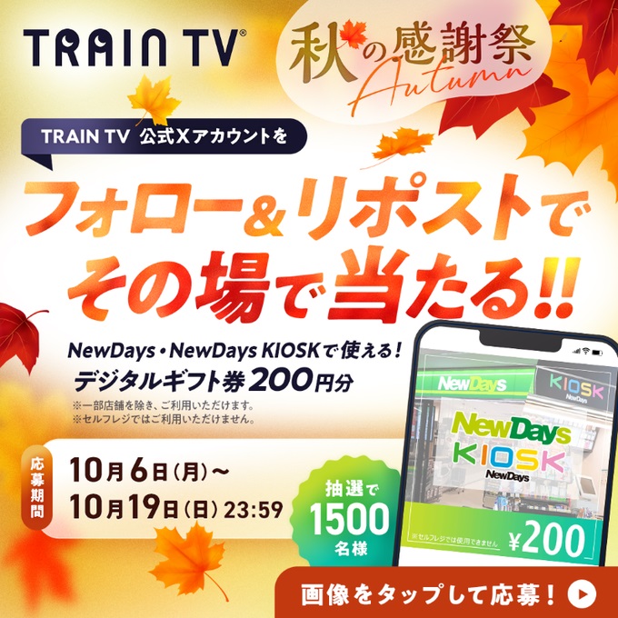 TRAIN TV公式Xアカウントをフォロー&キャンペーン対象ポストをリポストして、キャンペーンページからご応募ください。