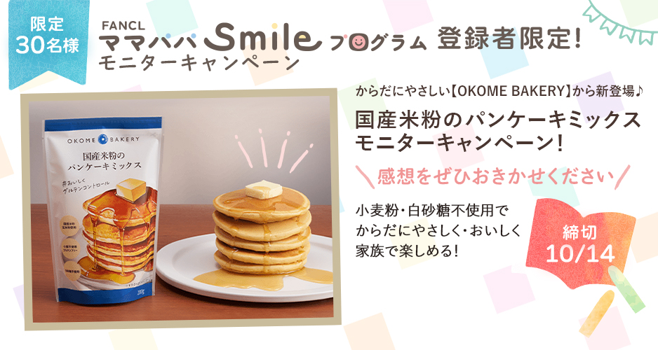 国産米粉のパンケーキミックスを30名様にプレゼント 2025.10.09 2025.10.08FANCL ママパパSmileプログラム‐モニターキャンペーン 賞品:国産米粉のパンケーキミックス(30名様) 締切:2025年10月14日(火)ご応募には会員登録/ログインが必要です。※詳細はキャンペーンページにてご確認ください。応募はこちらから
