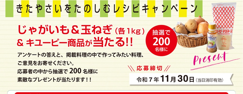 じゃがいも&玉ねぎ&キユーピー商品を200名様にプレゼント 2025.10.09きたやさいをたのしむレシピキャンペーン 賞品:じゃがいも&玉ねぎ&キユーピー商品(200名様) 締切:2025年11月30日(日)アンケートに答えてご応募ください。※詳細はキャンペーンページにてご確認ください。応募はこちらから