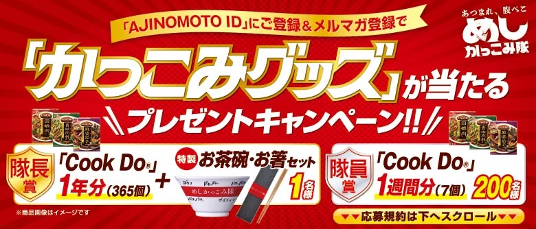 「AJINOMOTO PARK」メールマガジンご登録済みの会員の中から抽選で「Cook Do®」製品、特製お茶碗+特製お箸セットが当たります!