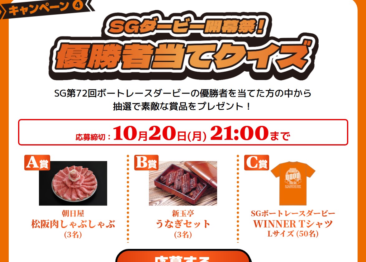 SG第72回ボートレースダービーの優勝者を当てた方の中から抽選で素敵な賞品をプレゼント!