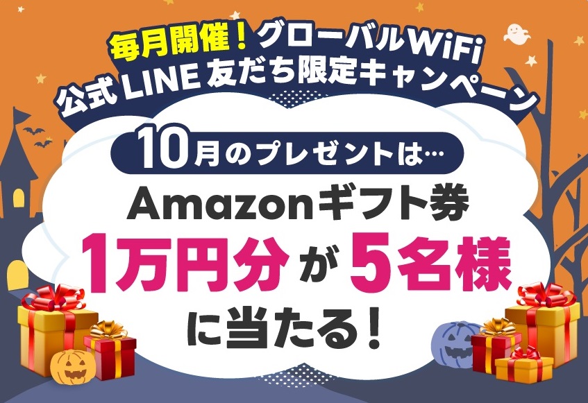 【LINE懸賞】Amazonギフト券10,000円分を5名様にプレゼント 2025.10.11グローバルWiFi 公式LINE友だち限定キャンペーン 賞品:Amazonギフト券10,000円分(5名様) 締切:2025年10月31日(金)アンケートに答えてご応募ください。※詳細はキャンペーンページにてご確認ください。応募はこちらから